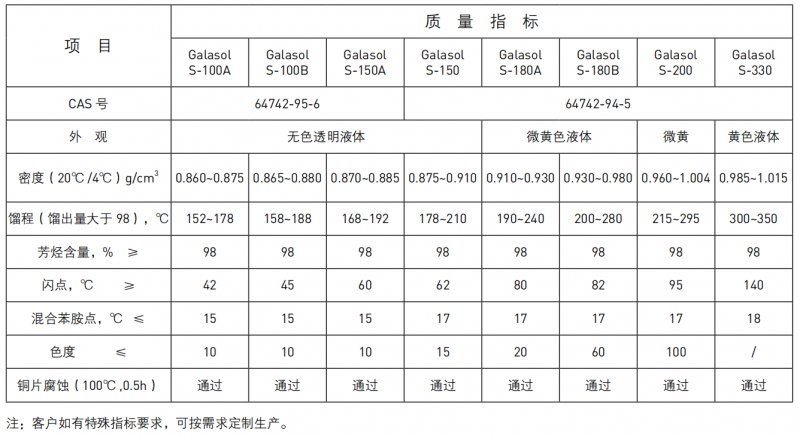 Galasol S-100 系列:用作油漆涂料及树脂溶剂,高级印刷油的配料,双氧水生产萃取剂,农药乳油溶剂等;